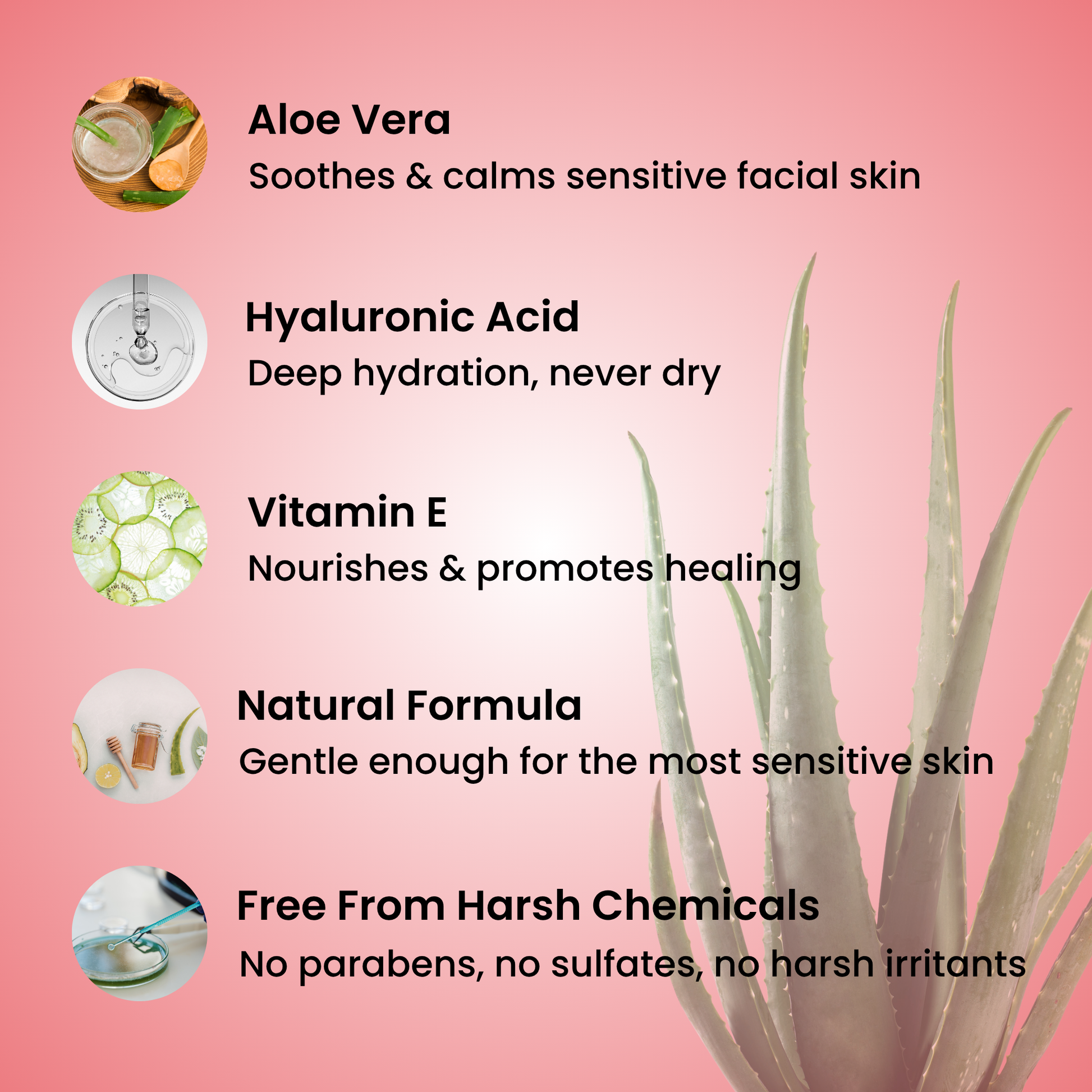 Yes! Our formula is dermatologist-tested and specifically designed for sensitive facial skin. It's enriched with Aloe Vera and Vitamin E to soothe and protect.